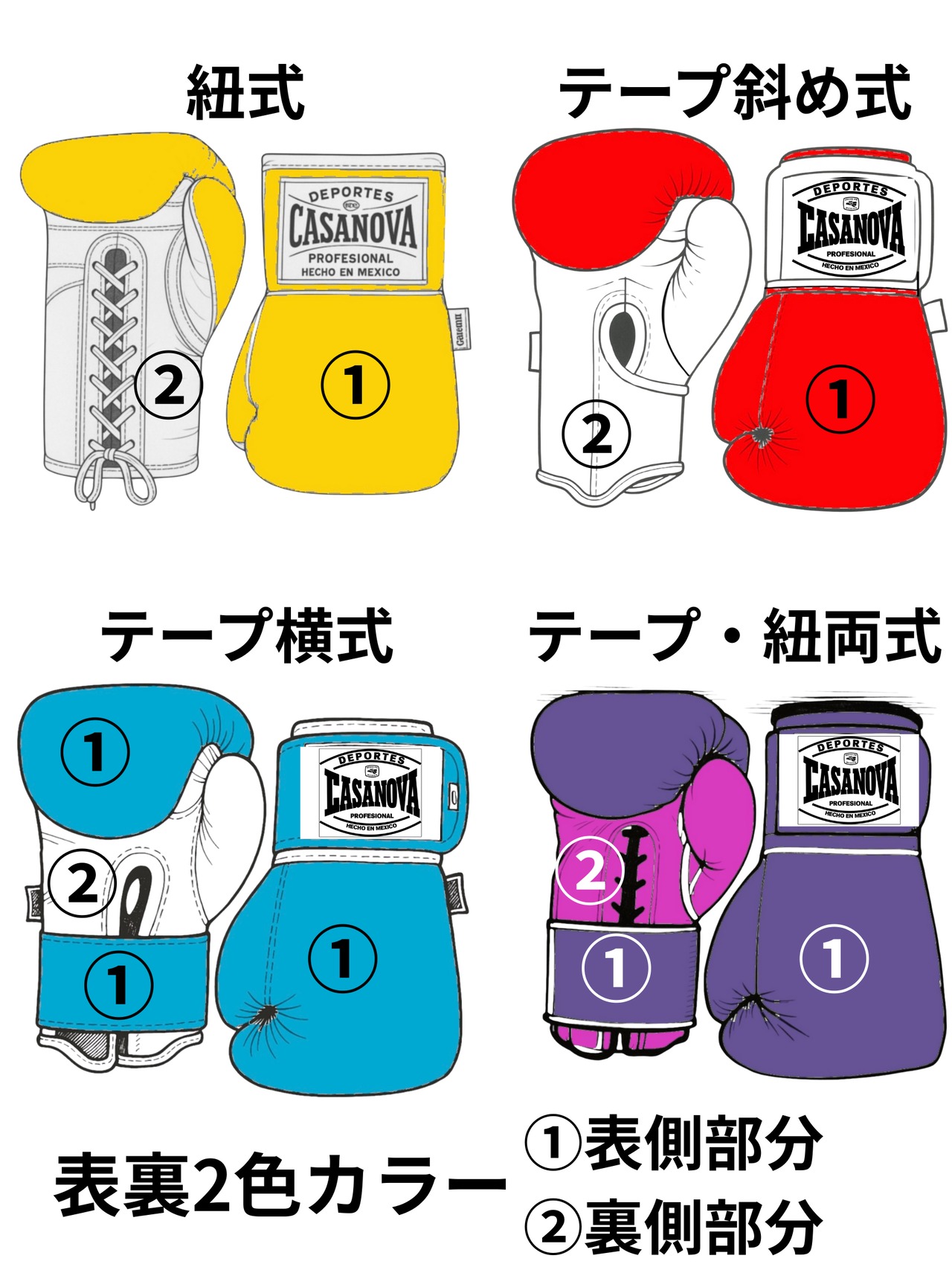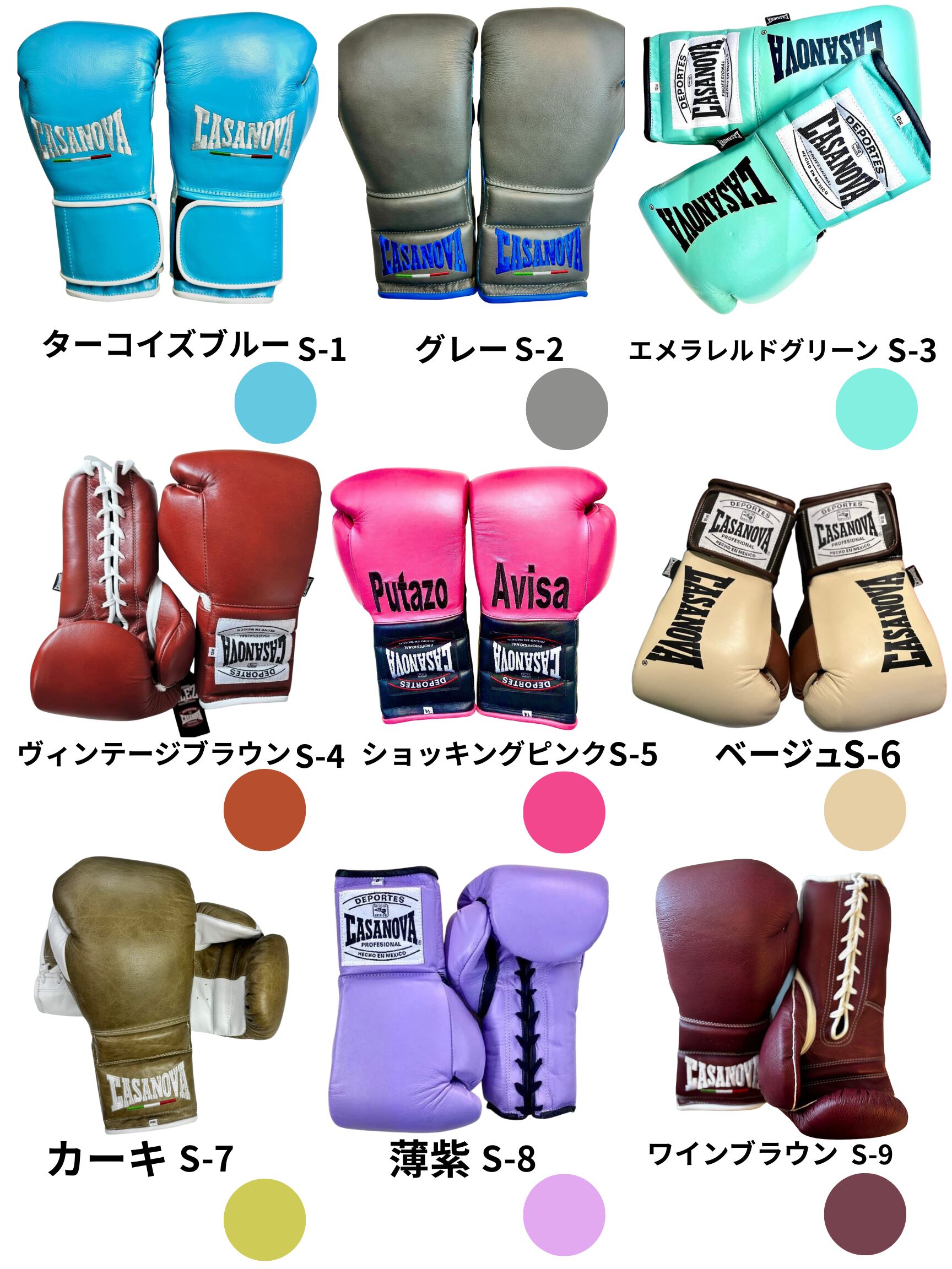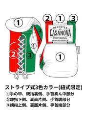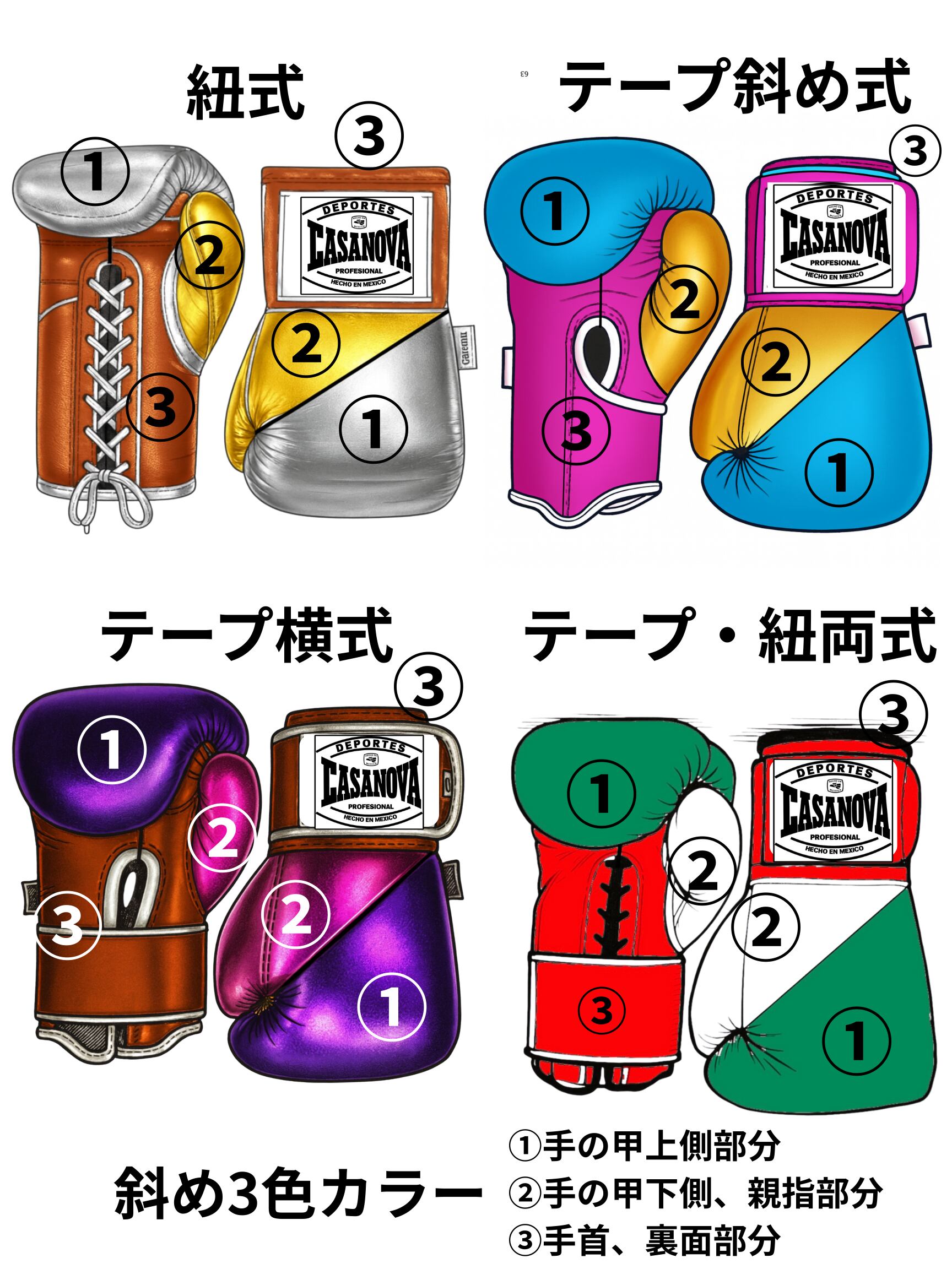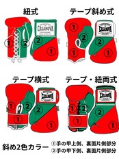 カラーの内容はオーダー表(サンプル写真から取得)の番号に沿って注文最後の備考欄ページでグローブタイプと割り振り番号に沿った希望カラーを入力して下さい。